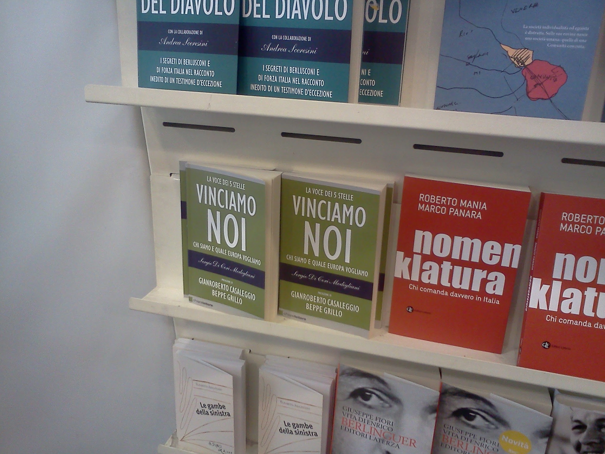 Poco prima delle elezioni c'è stato il 'Maggio dei Libri' con sconti consistenti, e ho fatto il giro di diverse librerie, a Firenze e non. Ho visto anche per la prima volta la Feltrinelli RED che ha preso il posto della vecchia libreria Edison in piazza della Repubblica: pochi libri, molti fighetti. Scenografia (è una scenografia) a volte risibile. Alfa, beta, gamma.. filosofia. Certo, se, come pare, Amazon negli USA ha già il cinquanta per cento del mercato dei libri, cartacei e non, le vecchie librerie devono inventarsi qualcosa per sopravvivere.